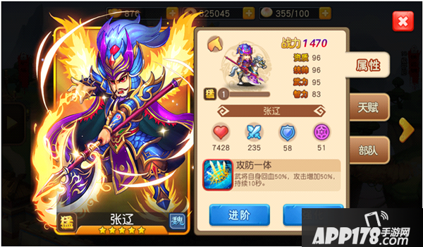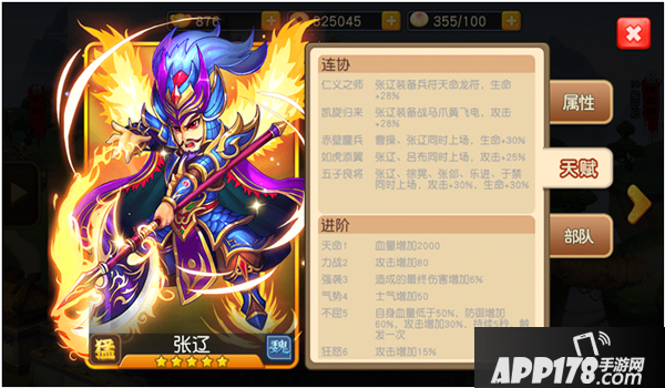身为五子良将之一的张辽,其连协技能和进阶技能也是非常的强悍,当五子良将同时上场时,更是有30%的攻击和生命加成,进阶技不屈,则是让张辽在低血量时更加的勇猛。