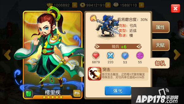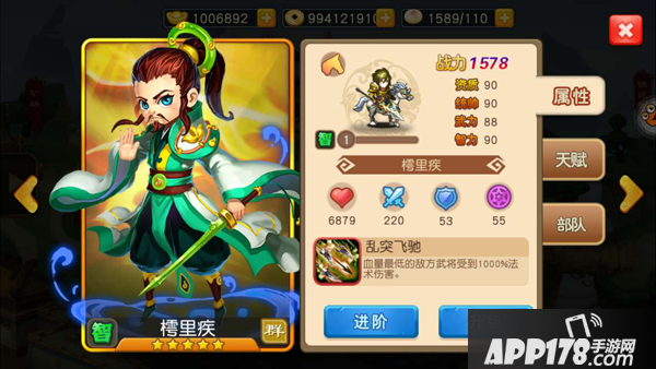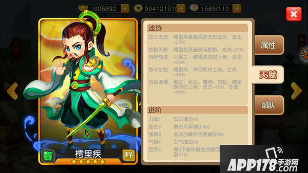 作为5星武将,樗里疾资质90,统帅90,武力88,智力90,初始战力1578。
