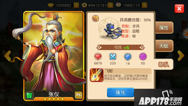 张仪同庸芮相同所配备的为弓兵,主要克制敌方步兵,移动速度快,随弓兵的强化等级提高兵种属性加成并且进行3次普攻后可使飞射技能对敌方步兵造成400%伤害。