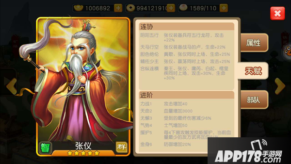 张仪连协与不同武将上阵主要以生命与攻击为主,对应5名武将上阵可获得生命攻击双属性加成。