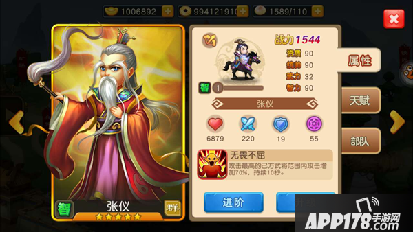 作为文臣其资质90,统帅90,武力32,智力90,初始战力1544。