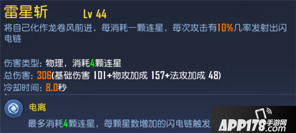 在上测中有BUG,所以这测直接算是回炉重造了,现在的雷星斩伤害看上去没有多少,其实也的确没多少。雷星斩是通过触发的闪电来制造伤害的,这一次,雷星斩有一个天赋:最多消耗4颗连星,每颗星增加闪电触发几率提高至22%,一共就是88%。不过这次闪电的威力下降了很多很多,每次闪电只有100+的伤害了,不过整体伤害可以有700左右,关键是技能CD只有8秒哦!