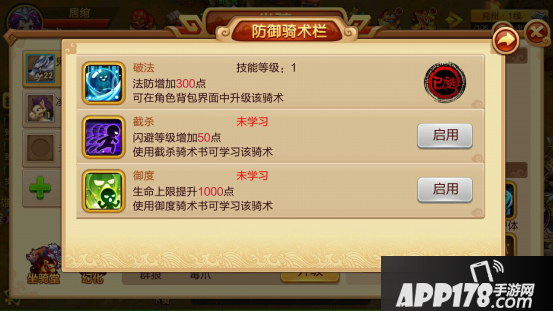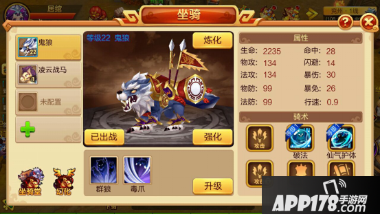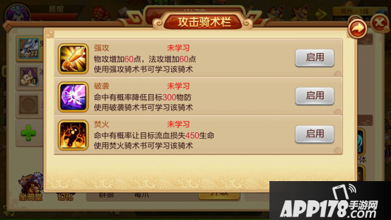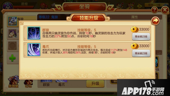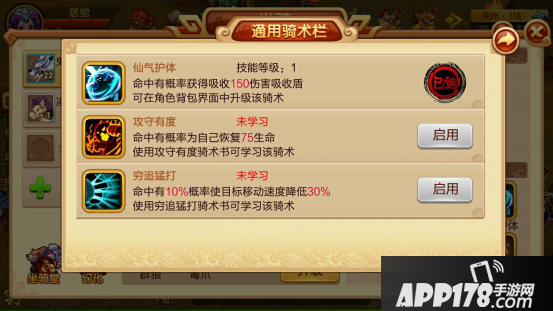每个坐骑天生会自带两个技能,技能同样可以升级。不同的坐骑自带的技能不同,自带技能不能够替换。