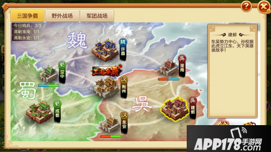 三国有各自的势力范围,吴国的势力范围位于东部沿海一带,国都为建邺;蜀国地处西部内陆巴蜀地区,国都在成都;魏国雄踞长江以北的广大中原地区,国都为许昌。三国各霸一方,相互对峙,形成鼎立局面,我们可以根据自己的喜好和心情自由选择。