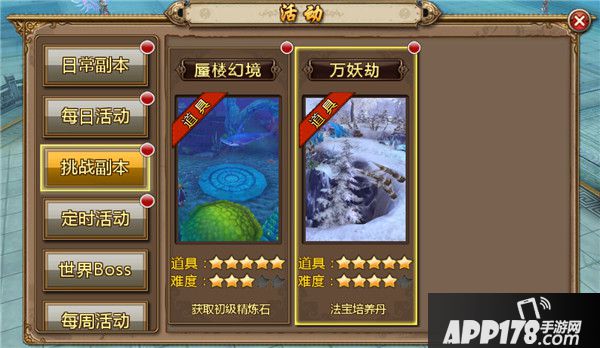 第四:挑战副本的【蜃楼幻境】以及【万妖劫】都是需要进行才完成的。可获得大量的精炼石以及法宝培养丹。