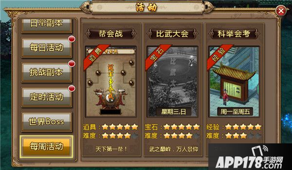 第七:您还可以参加每周的活动【帮会战】、【比武大会】、【科举会考】,也是可以有大量的奖励以及经验奖励的哦。