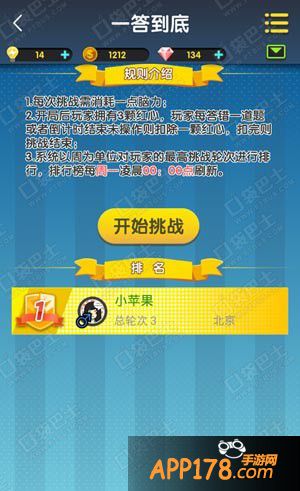 玩友们通过主界面,一下图标可以看到一答到底,点击进入就可以进行无尽答题了,只要你智力足够,脑力充足,你就是王者。