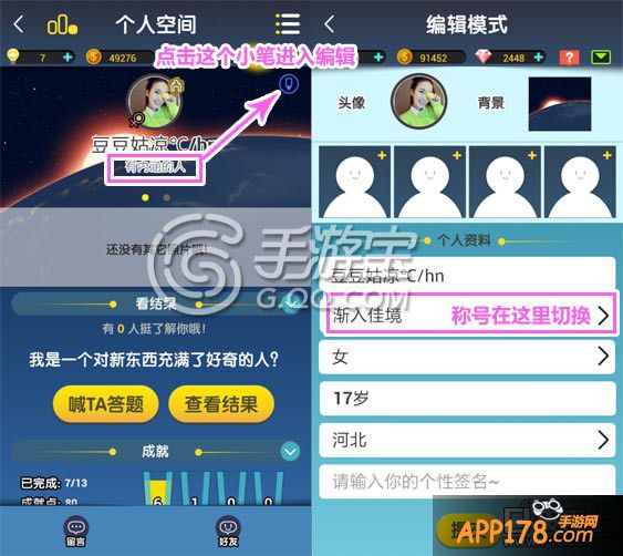 小编一直羡慕别人的名字下方显示的各种称号,而我一直带着土爆了的“新手”两个字,一番研究之后终于发现了其中的奥妙。在个人空间中,点击这个笔型图标可以进入编辑页面,在这里玩家可以设置自己的信息,称号也是在这里进行更改的。