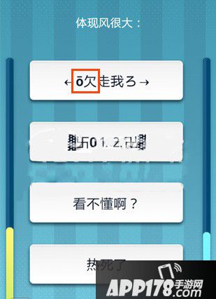 除了繁体字、冷僻字、外文以外,火星文中还常用图形和汉字组合成另外一个字,常见于左右结构的汉字。上图中的这个例子就是这样的,题目中体现的是风大,四个答案中最后两个显然不符合提议,前两个答案只有“走我”字是常用字,仔细观察其实“吹”字被拆分成了一个圆圈和一个“欠”字。对于这类语句只看我们能辨认出的部分无法判断含义,这时就需要将两个相邻的字(符合)合并起来看。这个答案的意思是“吹走我了”,与题目对应。