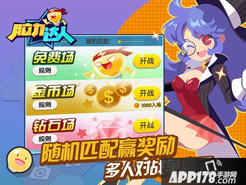 随机匹配是一答到底中的多人对战模式,分别有免费场、金币场、钻石场三种不同的场景,入场条件消耗也不同!三种场景每局分别都需要消耗1点脑力,而金币场则需要额外支付1000金币进入,钻石场需额外支付20钻石。自然场景开启对局消耗不同奖励也不会相同,金币场和钻石场获胜后都会获取大量的金币和钻石的奖励,而免费场则只有普通奖励!