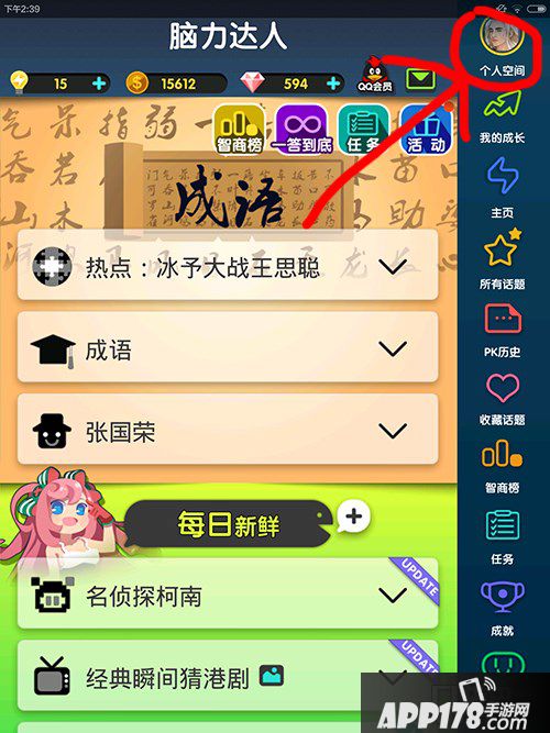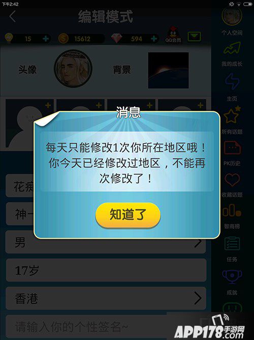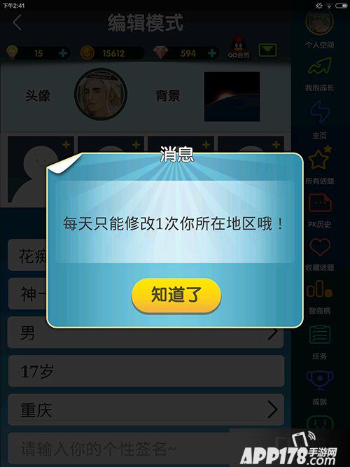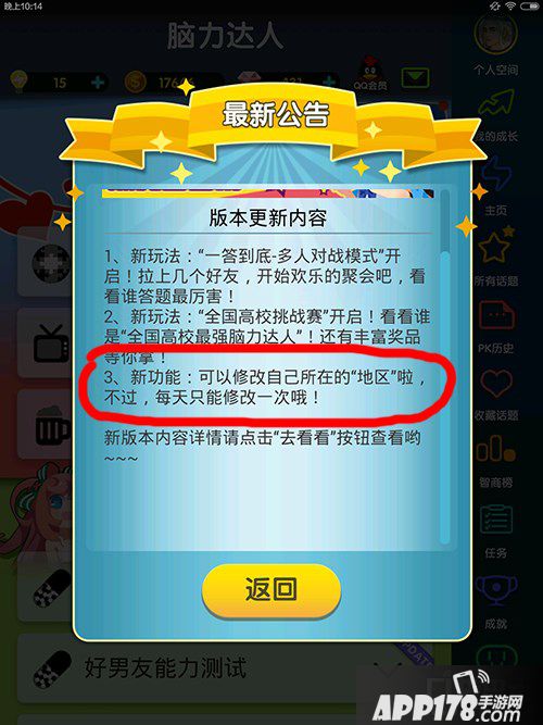 脑力达人今天更新了多人对战版本。本次版本更新主要是针对玩法,这个之前介绍过了。但是小编发现还有一个新内容。就是自己所在的地区可以换了。想知道怎么换的?让小编来个图解。