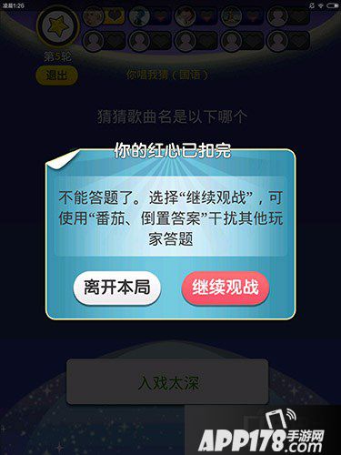如果答错三次系统就会提示你,红心扣完,不能答题。但是可以选择继续观战。而且观战过程中还可以使用“番茄”和“倒置答案”来干扰其他玩家。(⊙﹏⊙)b。人与人之间的信任呢~!?