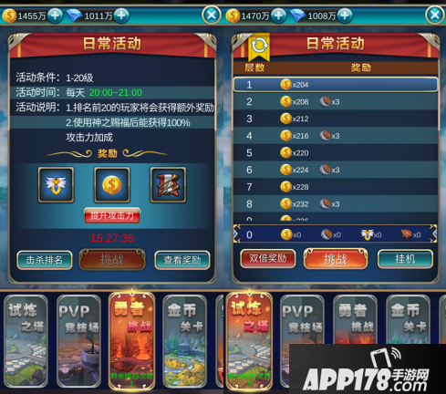 勇者挑战:警告!警告!前方高能,世界BOSS来袭,各位做好准备!!每日晚上8点,勇者挑战副本开放一小时。在勇者挑战的开放时间内,玩家会进入到自己等级对应的BOSS房间来挑战BOSS,然后根据击杀时间和总伤害来获得排名,开放时间过后可以通过最终排名来获取对应的奖励。