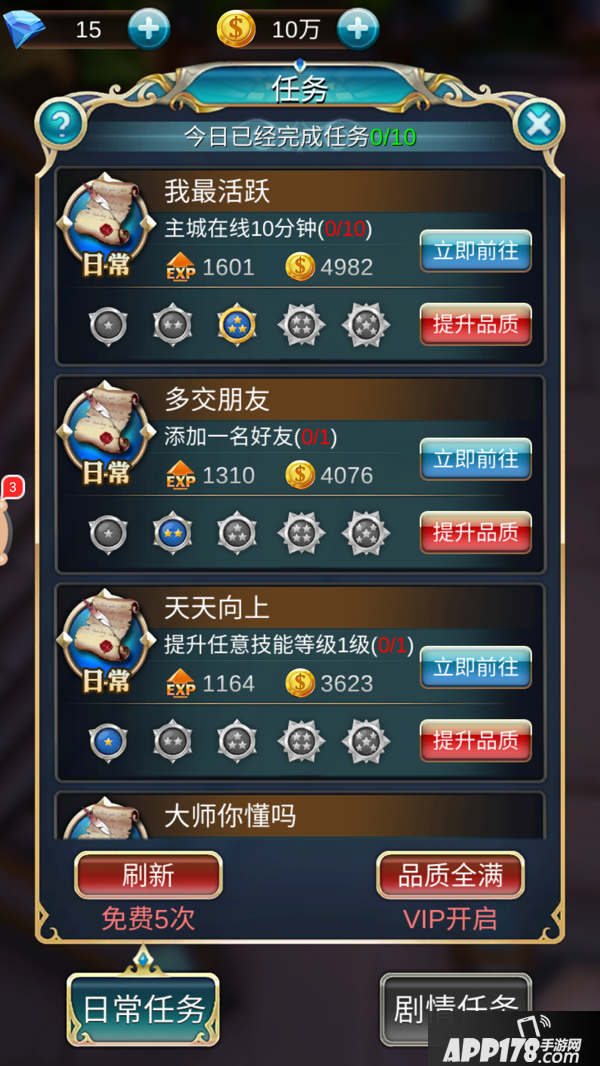 也许是因为刚上线没多久,游戏中的引导还做得不到位,所以很多玩家可能都没发现,这个功能就在主界面右侧的“任务”图标中,点击之后就能看到了,每天完成日常任务后提供大量经验,还能通过消耗钻石的方式提升任务品质。