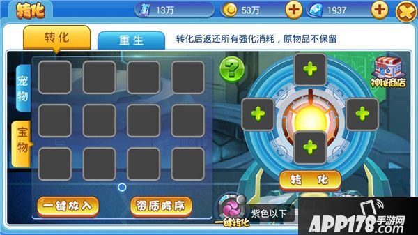 右下方的已将转化(紫色以下)按钮使用后可以将紫色以下不包括紫色品质的宝物一键全部转换掉,旁边的已将转化(橙色以下)按钮一样,可以将橙色以下不包括橙色品质的宝物一键全部转换掉