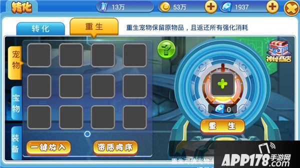 重生宠物保留原物品但会将宠物退回到原始状态可使宠物回到初始状态,并返还所有培养消耗,资质高的宠物重生需要消耗一定钻石;点击一键放入系统会自动将宠物栏中的宠物放至右方重生栏中,点击重生即可,重生后返还的培养消耗可用于其它宠物使用