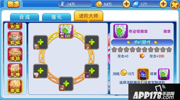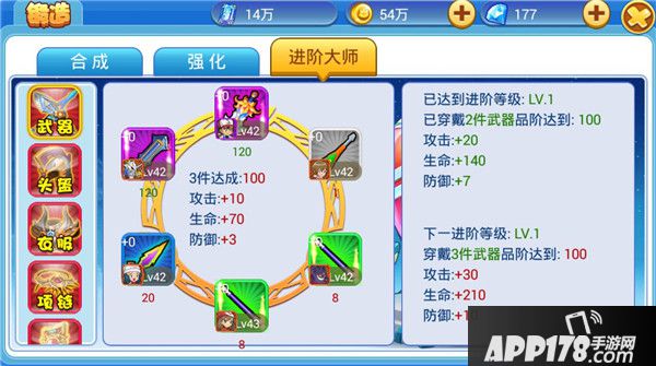 每件装备都有对应的装备品质数值,当所有上阵角色的同一个部位装备每当有一件到达一定数值后会触发进阶大师功能会额外增加攻击、生命和防御属性,进阶等级越高单件装备提升的装备基本属性越高,并且装备品质数值也会越高,装备品质数值越高进阶大师功能提供的额外属性也会越高