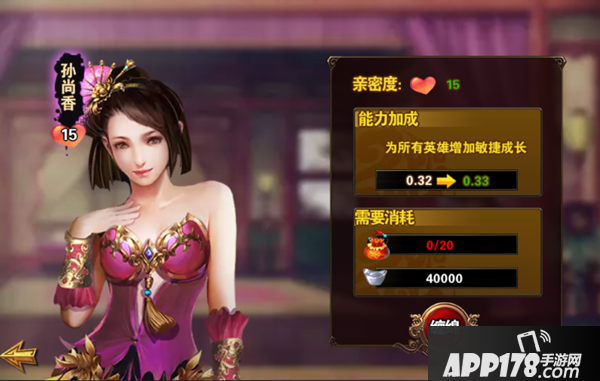 孙尚香是巾帼不让须眉的女中豪杰,感觉是很帅气的女子,同样利用香囊增加其亲密度,使其为所有英雄增加敏捷成长