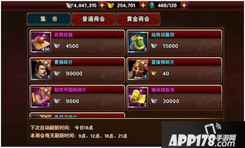 商会:这里玩家用元宝买到你想要的任何物品,例如武将碎片,技能书,战将招募符,武器装备图纸碎片等。