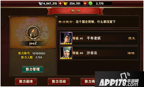 势力:玩家可以建造自己的势力范围,分为势力副本,活动,商店,和退出势力四大选项,在势力副本里可以挑战关卡并获得一定奖励;在势力活动里你可以享用大餐增加你的势力贡献值,在势力商店里用实力贡献值进行购买玩家所需的物品。