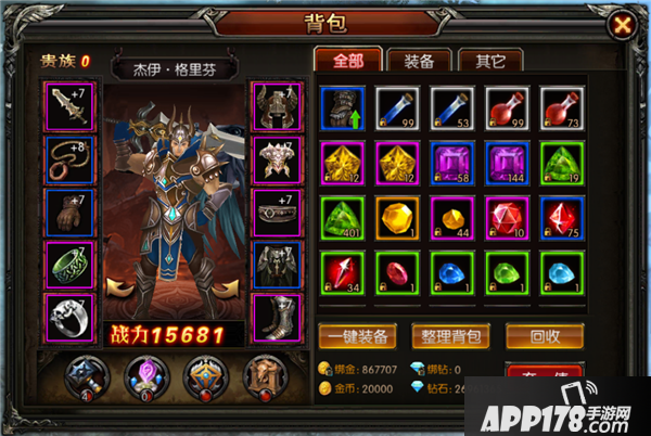 背包系统是游戏的基础系统,如果获得了更多的装备,可以使用回收功能来获得绑定金币及强化石,也可以将非绑定的道具挂到拍卖行小赚一笔。