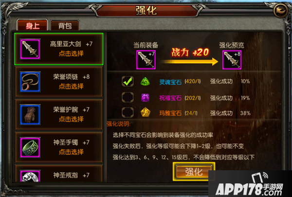 装备强化系统可以提高装备的基础属性,强化石可以通过分解装备获得,强化到3、6、9、12、15级时,失败不会掉级(很人性化吧)