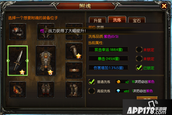 大幅度提高属性战力,大家一定要先洗出3条紫色(建议进行锁定)后,再进行洗练,这样就可以洗练出橙色甚至金色的属性了!
