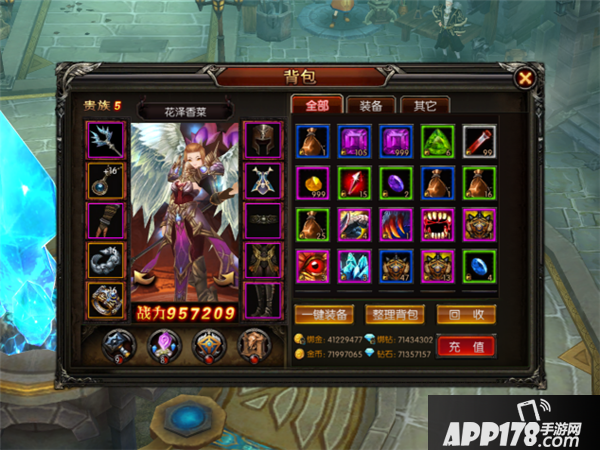 背包:顾名思义可以查看玩家的装备和道具,点击“一键装备”会穿戴玩家所拥有的最强装备,“整理背包”会将道具重新排列,“回收”可以回收玩家无用的装备。