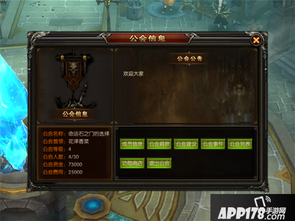 公会:公会可设置公会公告,左侧栏显示公会信息。