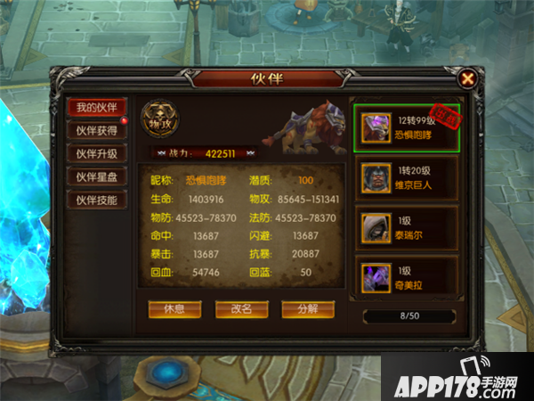 我的伙伴:可查看玩家已有的伙伴信息,可执行休息、改名、分解功能