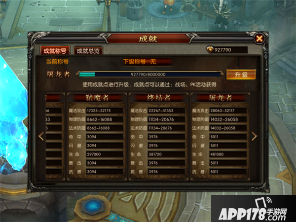 成就:通过完成任务可获取成就点,在成就功能中进行称号升级。