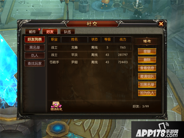 好友:好友功能可以邀请其他玩家并获取奖励,可以实现密聊、删除、查看玩家信息、邀请组队、将玩家加入黑名单、将玩家加为仇人功能。