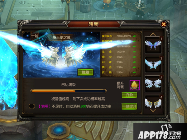 翅膀:《奇迹无双》当中最吸引人眼球的就是翅膀了,不仅仅外观华丽提升逼格,而且会提升人物相当高的属性,点击翅膀功能可针对角色的翅膀进行升级,同时消耗羽毛和火种。