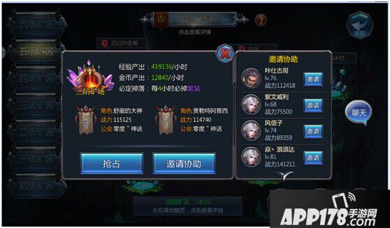 矿洞由等级由高到低分为6个等级,随着等级的提升可以开放更高级的矿洞,当然越高级的矿洞获得的经验也会越高。同一等级中的矿洞也分优劣,中间三阶的矿是每个玩家的梦想咯。如果遇到高战力的玩家守着矿洞怎么办?这个时候当然是果断抱大腿啦!矿洞可以邀请公会成员或者好友共同挑战,只要你的大腿够粗,多高阶的矿你都值得拥有。同样的,守矿你也可以邀请大神协助,让你的矿洞固诺金汤。
