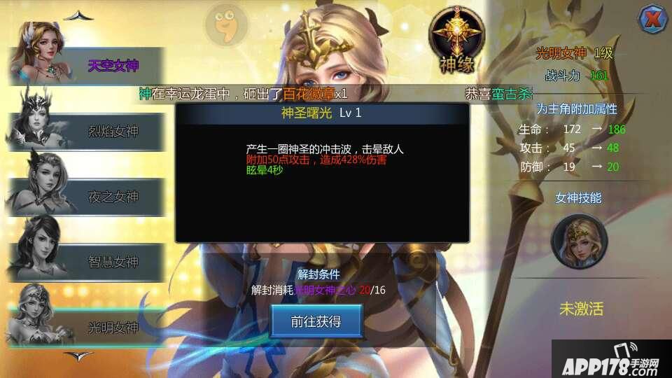 3,女神系统,对于游戏前期,部分女神可以通过专属副本打出来!但是橙色的只能龙蛋砸出,所以,我们可以简单的砸龙蛋收集到光明或者智慧女神后就不要砸了!等后期钻石多了在砸