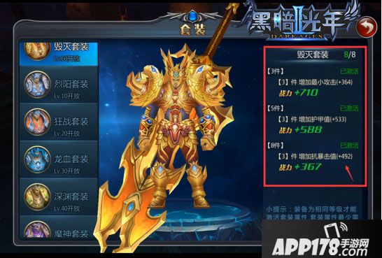按照不同等级条件逐渐开放,分别为:烈阳套装、狂战套装、龙血套装、深渊套装、魔神套装、毁灭套装,每个套装超级炫酷,每天可以轮着换。