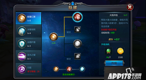 《黑暗光年2》中,法师有5种主技能:能量汇聚,冰锥刺地,冰霜护盾,圣光之耀,闪现,充分展现法师强大的魔法力量,技能效果华丽超炫。角色达到一定等级依次开放以上主技能。主技能需要不断升级,当主技能升级到一定等级,可以触发该主技能的多个辅助技能。 此外,升级辅助技能还可以激活该技能的连击。连击技能伤害输出大,战斗更给力。