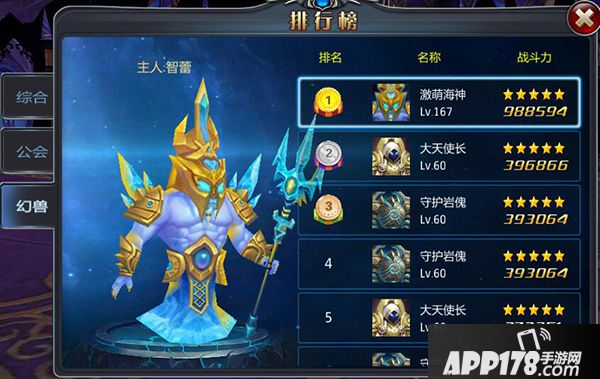 在幻兽排行榜上,还可以查看幻兽的排名、头像、名称、等级、主人、战斗力等。