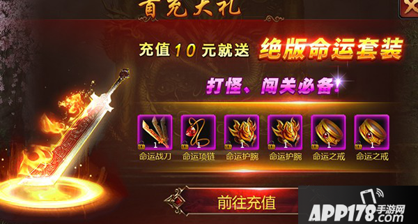 初入游戏,先来个首充是非常有必要的。首充送的命运套装属性是非常不错的。小编经过研究发现,命运套装的属性要比任务送的40级白装高一点,很好的解决了前期的装备问题。