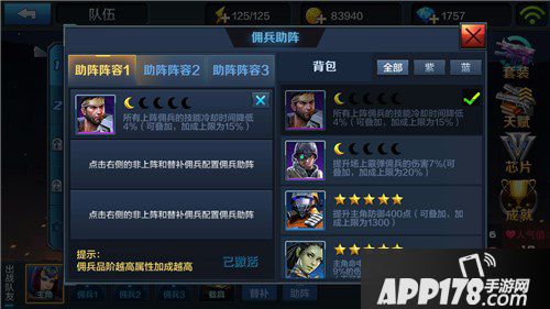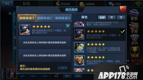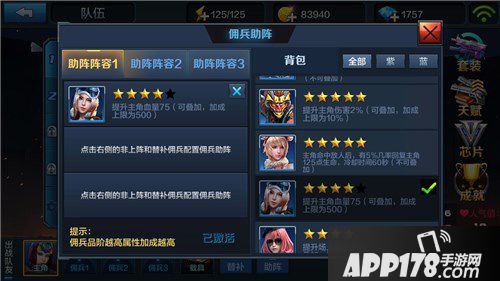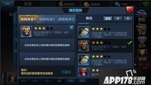 首先不要去选择增加佣兵伤害和防御的助阵佣兵。因为大多数的0元党主战佣兵都不满级满阶,武器装备更是没有怎么升级。在挑战和闯关模式里,佣兵的输出也不高。因此助阵系统内添加这些佣兵的意义不大。
