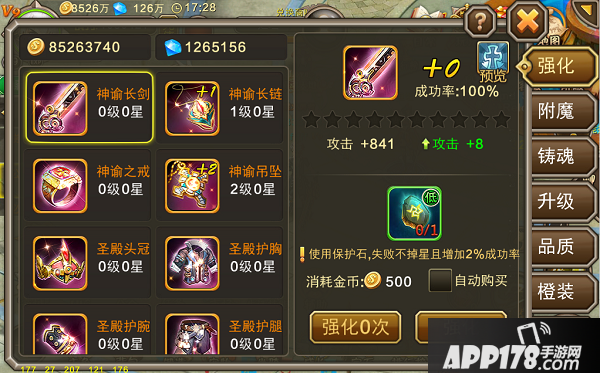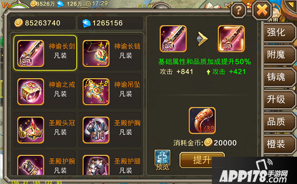 值得注意的是,即使是先把装备提升为神装,再提升品质等级的话,神装对品质提升的加成也是有效的,所以不用担心品质未达到最高就提升神装会吃亏哦~