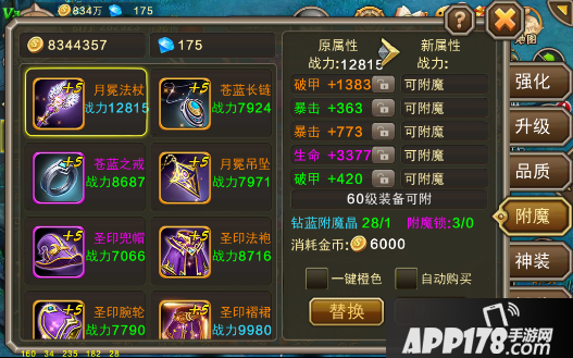 装备附魔需要需要使用钻蓝附魔晶这种物品,异域历险、狩魔之战和精英BOSS等玩法互动都有产出,而且产出比较容易,是前期比较推荐去提升的一个系统。附魔的槽位是根据装备等级而开启,比如说你武器40级,就有4个附魔槽,你的衣服升级到50级就开放第5个附魔槽,最多开放6个附魔槽。只要你点击右下角的附魔按钮,就会给你洗出不同的属性,新附魔出来的属性在上方会有战力对比,只要看见战力较高的替换过去就可以了。当然如果你洗出了紫色或橙色这种万中无一的高级属性,想要锁住它不让它替换掉,在拥有附魔锁的情况下,在附魔之前点击属性右侧的锁头按钮,属性上锁后再进行附魔和替换就可以了。注意附魔锁的使用顺序不能乱哦~