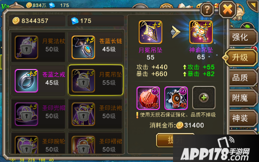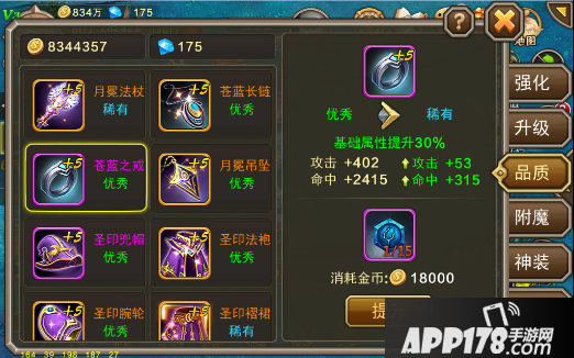 装备品质分为4个级别,分别是普通、优秀、稀有和完美,提升装备品质只需一种材料,并且100%成功,那就是品质石。别看着似乎很简单,因为品质石前期产出途径较少,概率较低,属于游戏的珍稀物品,所以算是装备里比较难提升的一个系统了。从普通升到优秀品质,每件装备需要5个品质石,全身装备优秀后会激活一个成就,建议大家有条件先把全身装备品质提高到优秀,然后再囤好品质石集中提升武器、护符、吊坠和戒指四个,提高攻击力。