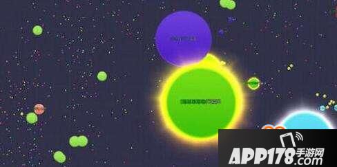 这里绿球想要吃紫球,但是分身不够,所以打算要侧涨,先让一个队友靠近紫球,然后自己紧贴队友,要注意控制距离不要在一个直线上,中间的队友要稍微往旁边走一点,不然就白送了。