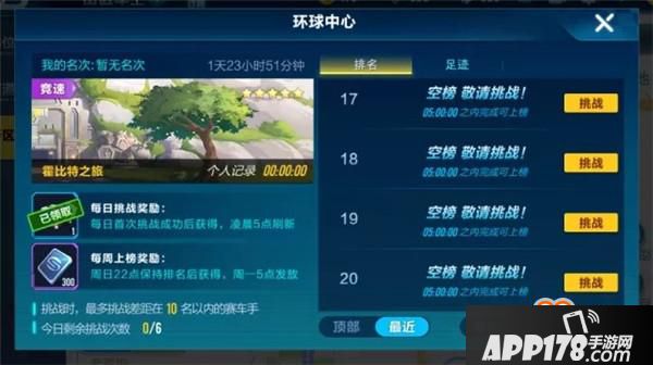 做好比赛准备之后,车手们就可以选择想要挑战的地点了!点击街区中的赛场图标,即可打开赛场排行榜界面。点击排行榜中其他车手的挑战按钮,开始你的挑战之旅!