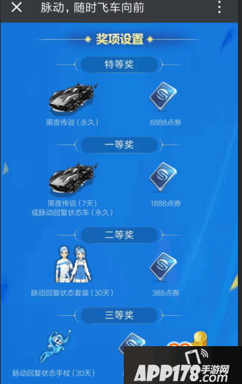 二等奖:脉动回复状态套装(30天)+388QQ飞车手游点券,共3000万份,中奖率30%