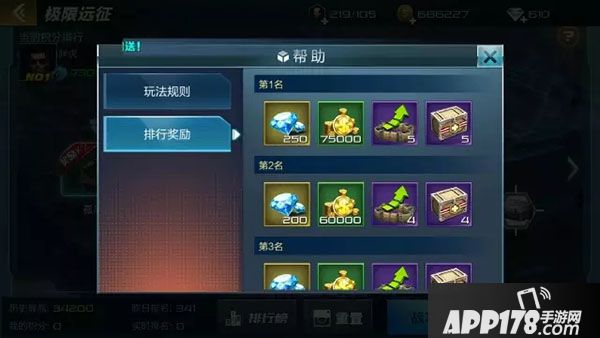 进入“极限远征”模式后,右上角有一个问号按钮,点击问号按钮就会弹出规则说明框,会一目了然的给大家简单介绍游戏“玩法规则”“排名奖励”等。“排名奖励”则是玩家根据目前极限远征的积分进行排序后,对应的奖励展示。