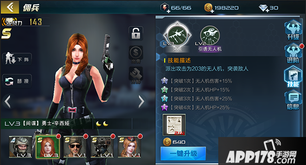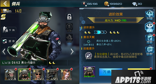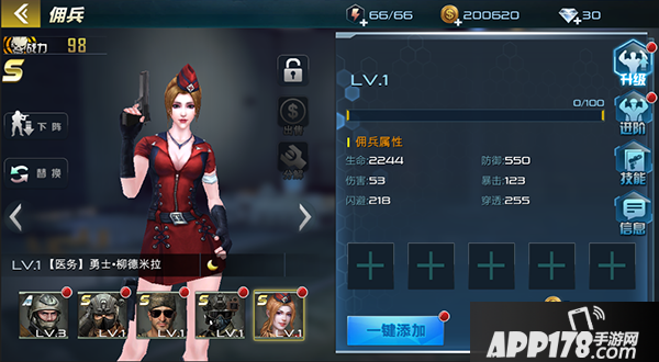 佣兵拥有不同的等级:S、A、B级,S级自然是最强佣兵。佣兵界面右侧是基础属性,佣兵可提升自身升级、技能等级。低品质佣兵还可以进阶提升战斗力。