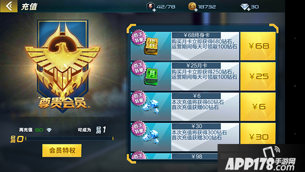 充值界面中具有月卡,终身卡,和不同档位的钻石充值。