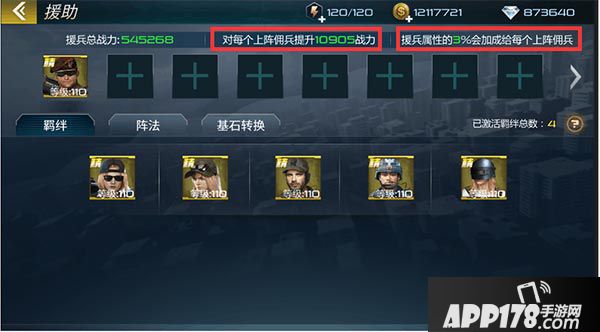 羁绊中,援兵与上阵佣兵之间互相有属性加成,触发条件点击佣兵即可看到。